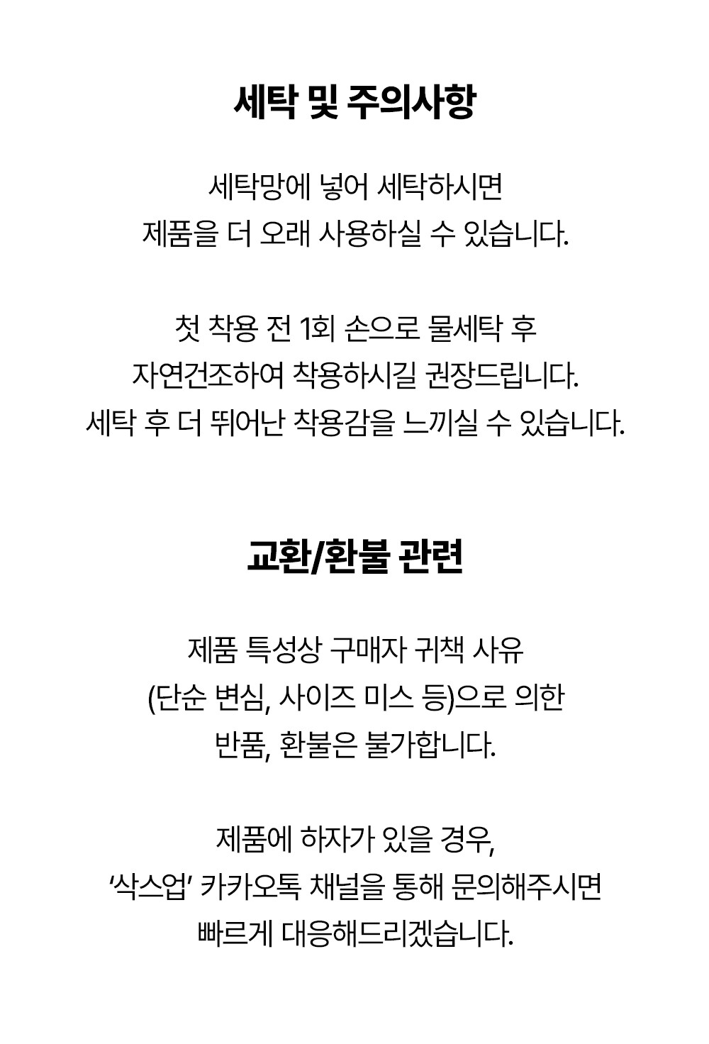 ② 사이즈미스의 경우도 ①번과 동일한 사유로 반품, 교환이 불가하기 때문에 삭스업 카카오톡 1:1 문의를 통해 상세한 사이즈 상담 후 구매하시길 권장드립니다.