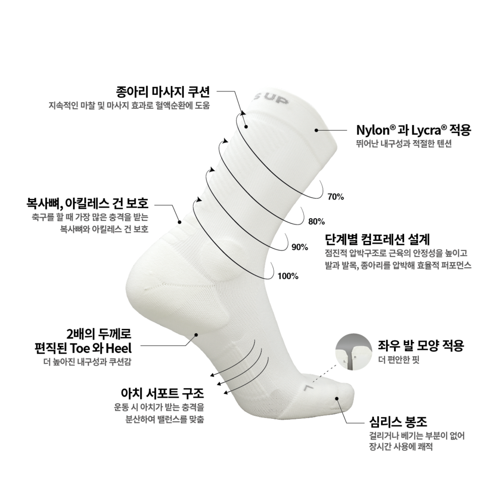 이 두마리 토끼를 잡기 위해 탁월한 회복성과 부상 예방을 기대할 수 있는 컴프레션 기술의 전문가를 찾아, 축구에 최적화된 제품을 개발하였습니다. 컴프레션 기술은 양말의 각 부위별 압박강도를 점진적으로 조절해서 사용자의 편의와 운동 중 회복을 최대한으로 돕는 기술이예요.