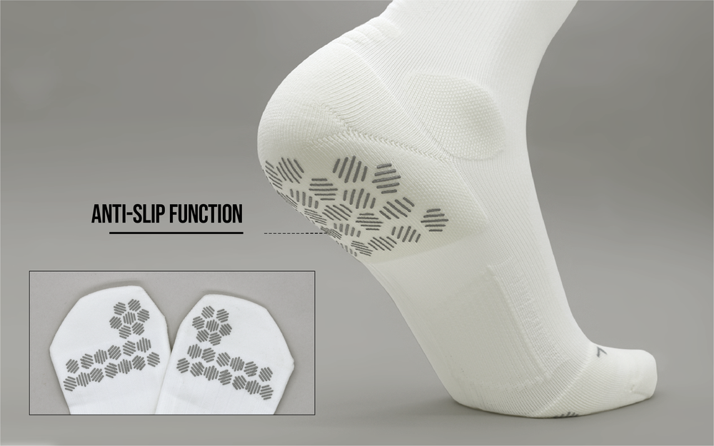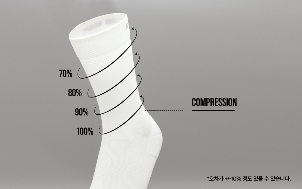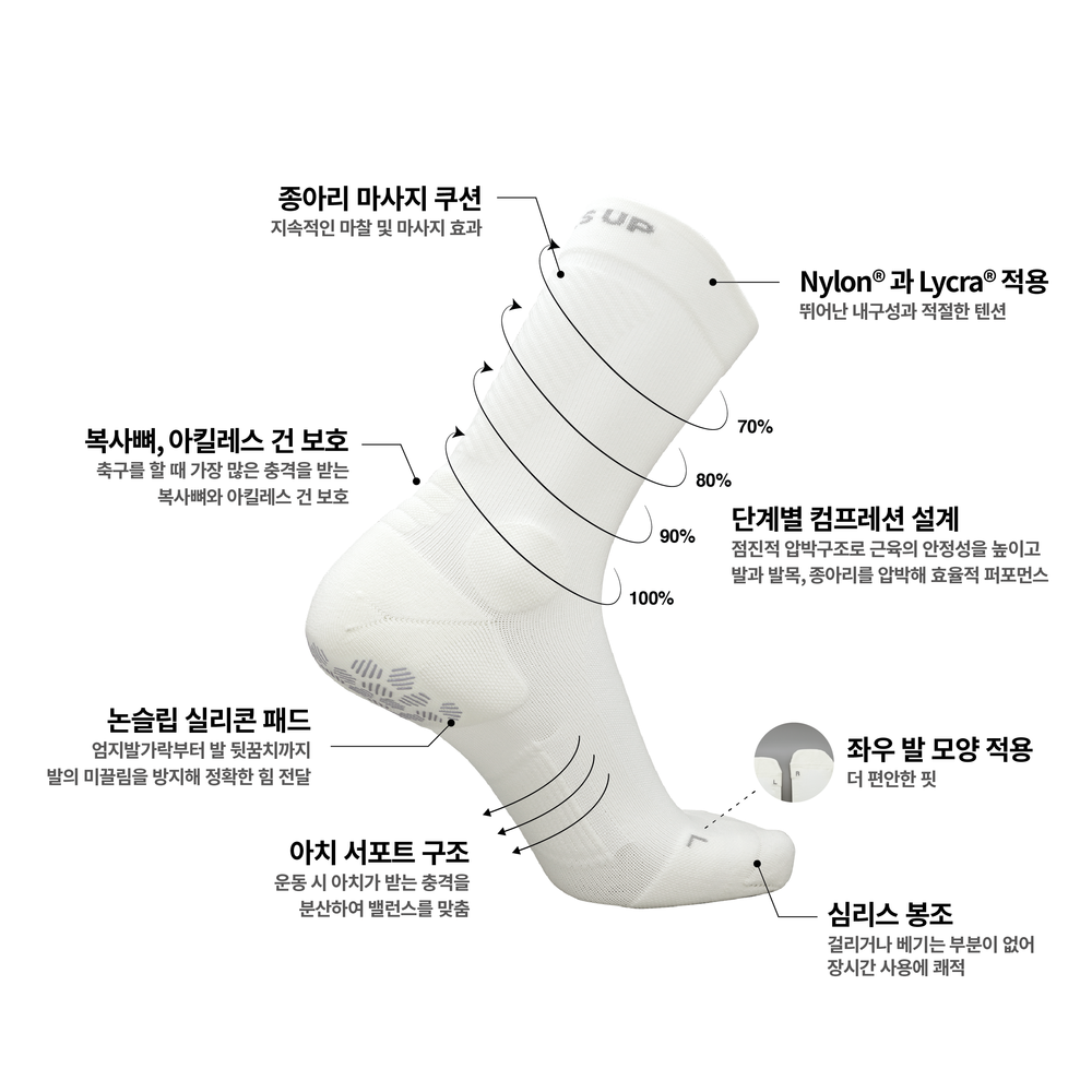 이 두마리 토끼를 잡기 위해 탁월한 회복성과 부상 예방을 기대할 수 있는 컴프레션 기술의 전문가를 찾아, 축구에 최적화된 제품을 개발하였습니다. 컴프레션 기술은 양말의 각 부위별 압박강도를 점진적으로 조절해서 사용자의 편의와 운동 중 회복을 최대한으로 돕는 기술이예요.